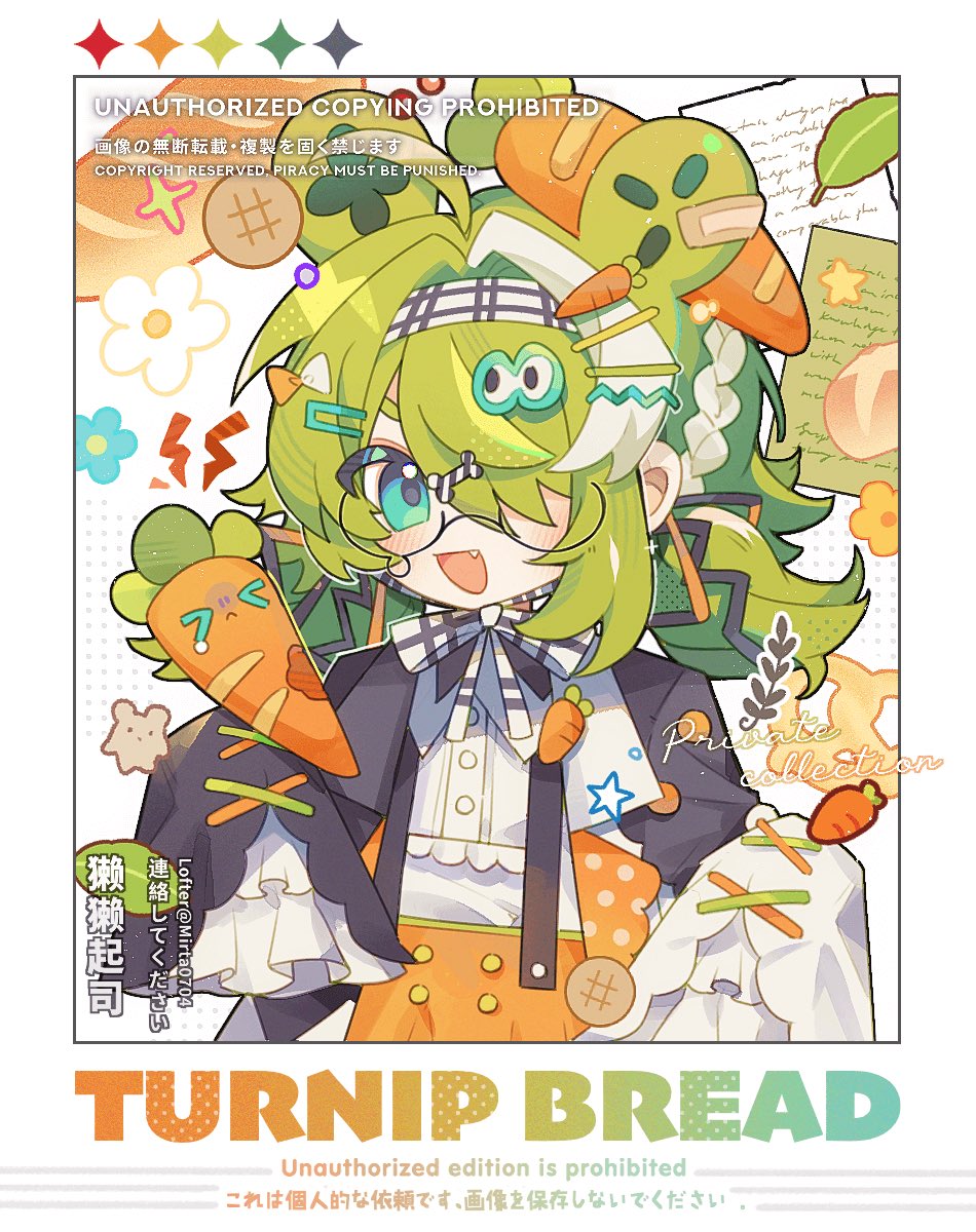 :d1girlahogeblack shirtblack-framed eyewearblue eyesblushborderbraidcarrotcarrot hair ornamentfangfoodfood-themed hair ornamentfrilled sleevesfrillsglassesgreen hairhair intakeshair ornamenthair over one eyehairbandholdingholding foodlong hairlong sleeveslooking at viewermulticolored hairopen mouthround eyewearshirtsleeves past fingerssleeves past wristssmilesoloteardrop-framed glassestwo-tone hairupper bodywatermarkwhite borderwhite hairwhite hairband