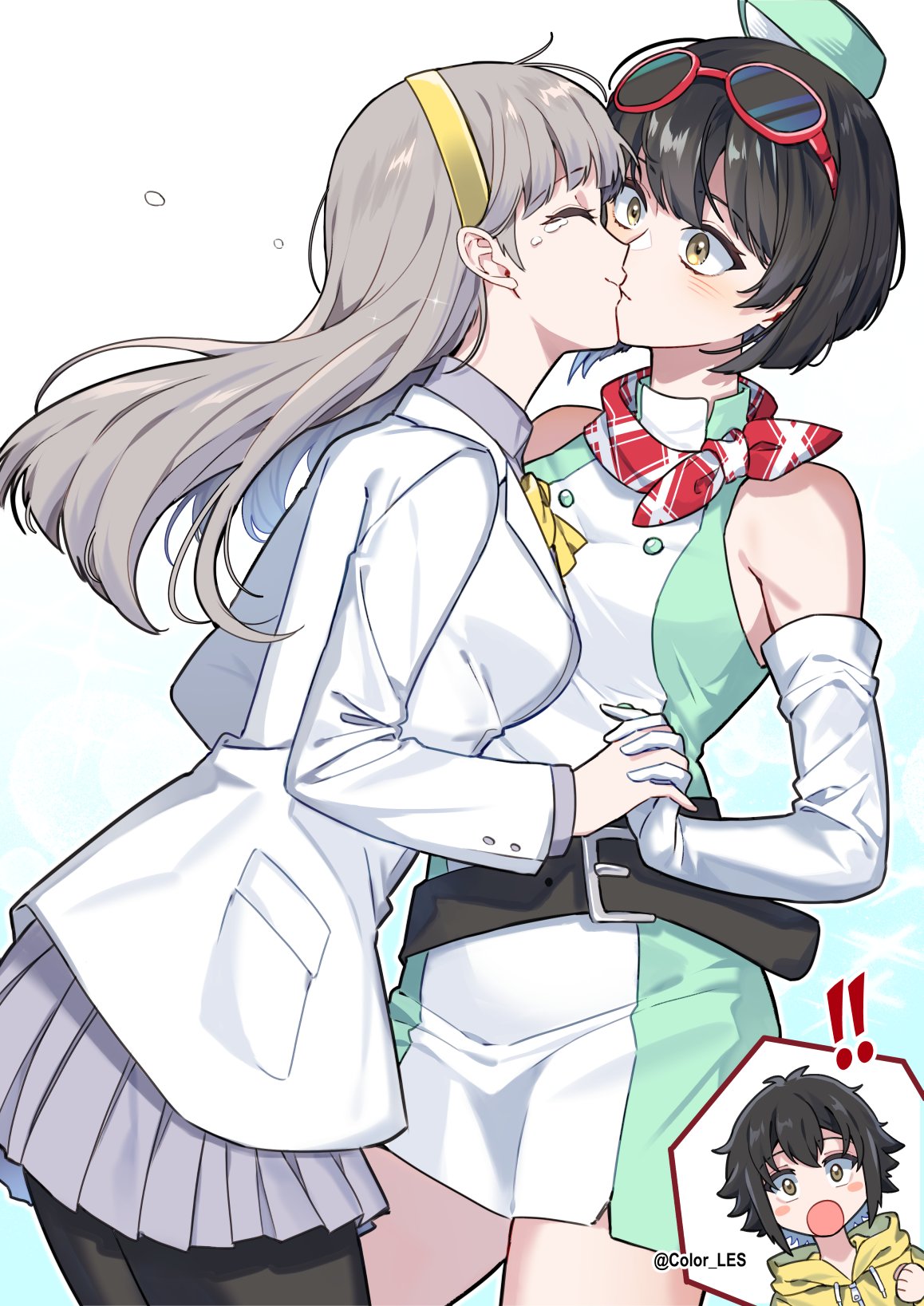 1boy2girlsbare shouldersblack hairbreastscoupledressfrench kissglovesgogglesgoggles on headgreen dressgreen hatgrey hairgrey shirthatinori yuutajacketkisslarge breastslong hairmultiple girlspantyhoseshirtshort hairsiblingssimple backgroundvestwhite backgroundwhite dresswhite gloveswhite jacketyuri