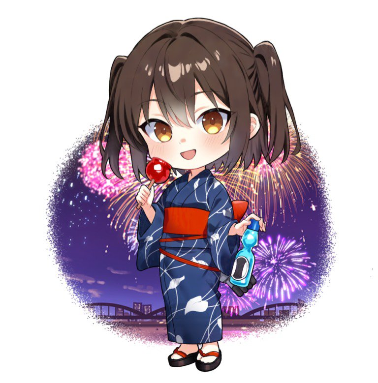 1girlblack hairblue kimonobridgebrown eyescandy applechibifoodfull bodyhair between eyesjapanese clotheskimonoleaf printlong sleevesnightobiofficial alternate costumeramunesandalssashshort hairsmilesolostandingtwo side upwide sleeves