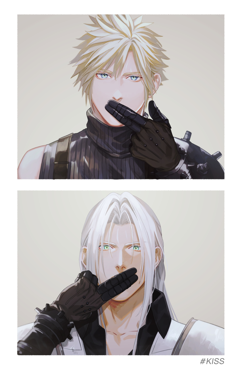 2boysarmorarmored glovesblack coatblonde hairblue eyesblue shirtbordercoatearringsfinger to another's mouthfingers to mouthgreen eyesgrey backgroundgrey hairhair between eyesindirect kissjewelrylong hairmale focusmultiple boysparted bangspauldronsshirtshort hairshoulder armorsingle bare shouldersingle earringsingle pauldronslit pupilsspiked hairsuspendersupper bodywhite borderyaoi