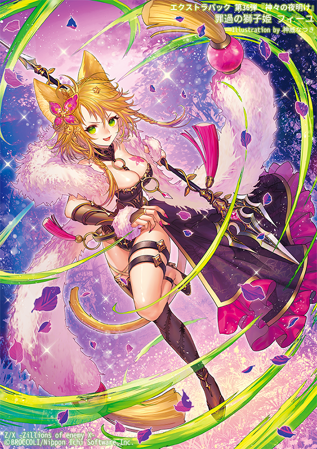 animal earsblack leotardblack shoesblack thighhighsbraidbreastsbrown hairbrown tailcat earscat girlcat tailcleavagefur trimgold trimgreen eyeshair ornamentlarge breastsleotardopen mouthpink skypurple petalsshoesside braidsingle thighhighskysparkletailthigh strapthighhighs
