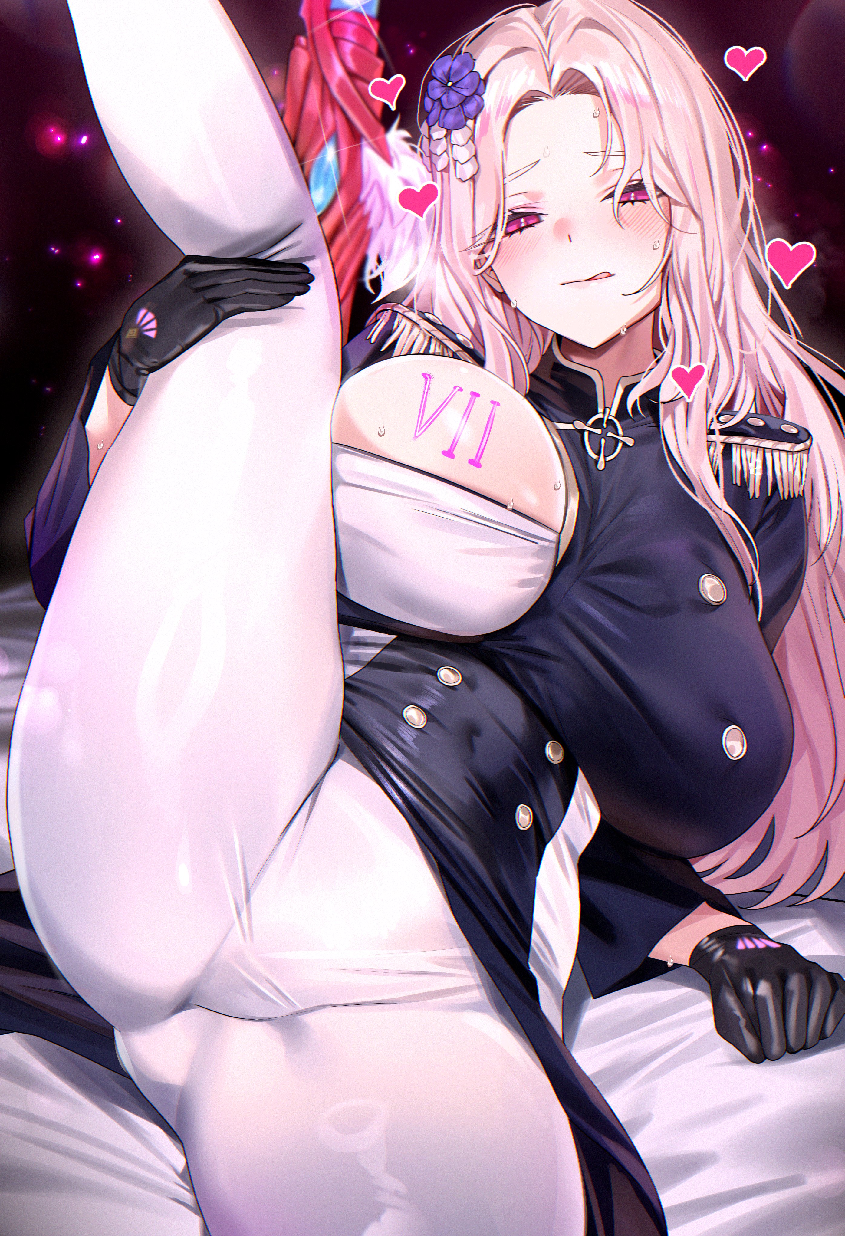 :q1girlaiguillettebed sheetblack jacketblonde hairblushbreast cutoutbreast tattoobreastscovered navelflowerhair flowerhair intakeshair ornamentjacketlarge breastsleg liftlong hairlong sleeveslooking at viewernaughty faceon bedpantspink eyesroman numeralsmilesolosweattattoothick thighsthighstonguetongue outwhite pants