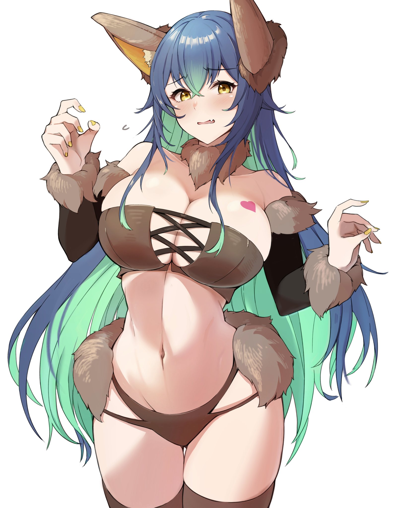 1girlanimal costumeanimal earsbikiniblue hairbreastsbrown bikinibrown thighhighscleavagecolored inner hairdetached sleevesembarrassedfangflying sweatdropsgloria (z/x)green hairhuge breastslong hairmulticolored hairnavelopen clothessoloswimsuitthighhighswhite backgroundwolf costumewolf earsyellow eyesyellow nails