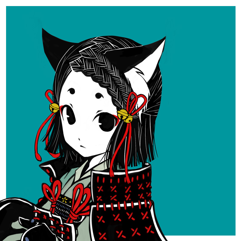 1girlanimal earsaqua backgroundarmorbellblack eyesblack hairbordercat earscolored skineyelinerfemale focusflat colorhelmethikimayujapanese armorjapanese clotheskotemakeupsamuraishort eyebrowsshort hairshoulder armorsimple backgroundsodesolounworn headwearunworn helmetwhite skin