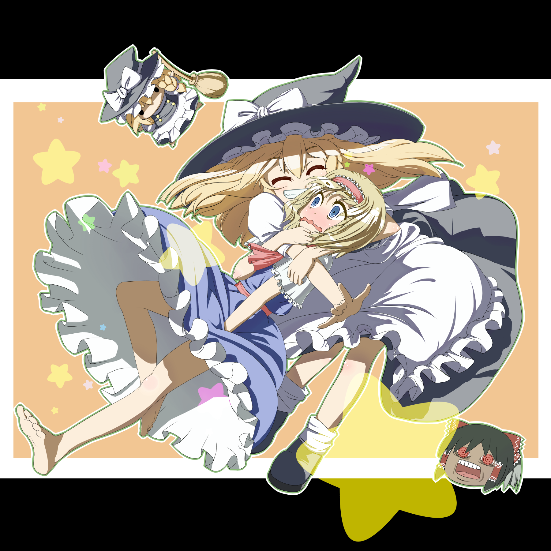 3girlsbarefootblonde hairblue eyesblushbraidcharacter dolldolldressfemale focusfull bodyhatmultiple girls