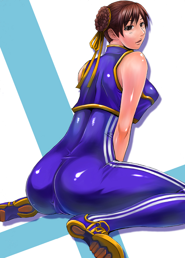 :d1990s (style)1girlassbare shouldersbetween legsblushbodysuitbreastsbrown eyesbrown haircameltoecrop topdouble bundouble vertical stripefemale focushair bunhair ribbonhand between legslarge breastsleaning forwardlooking at viewerlooking backopen mouthparted bangsprofileretro artstyleribbonshadowshiny clothesshiny skinshoesshort hairsimple backgroundsittingskin tightsleevelesssmilesneakerssolounitardwarizawhite backgroundwide hips