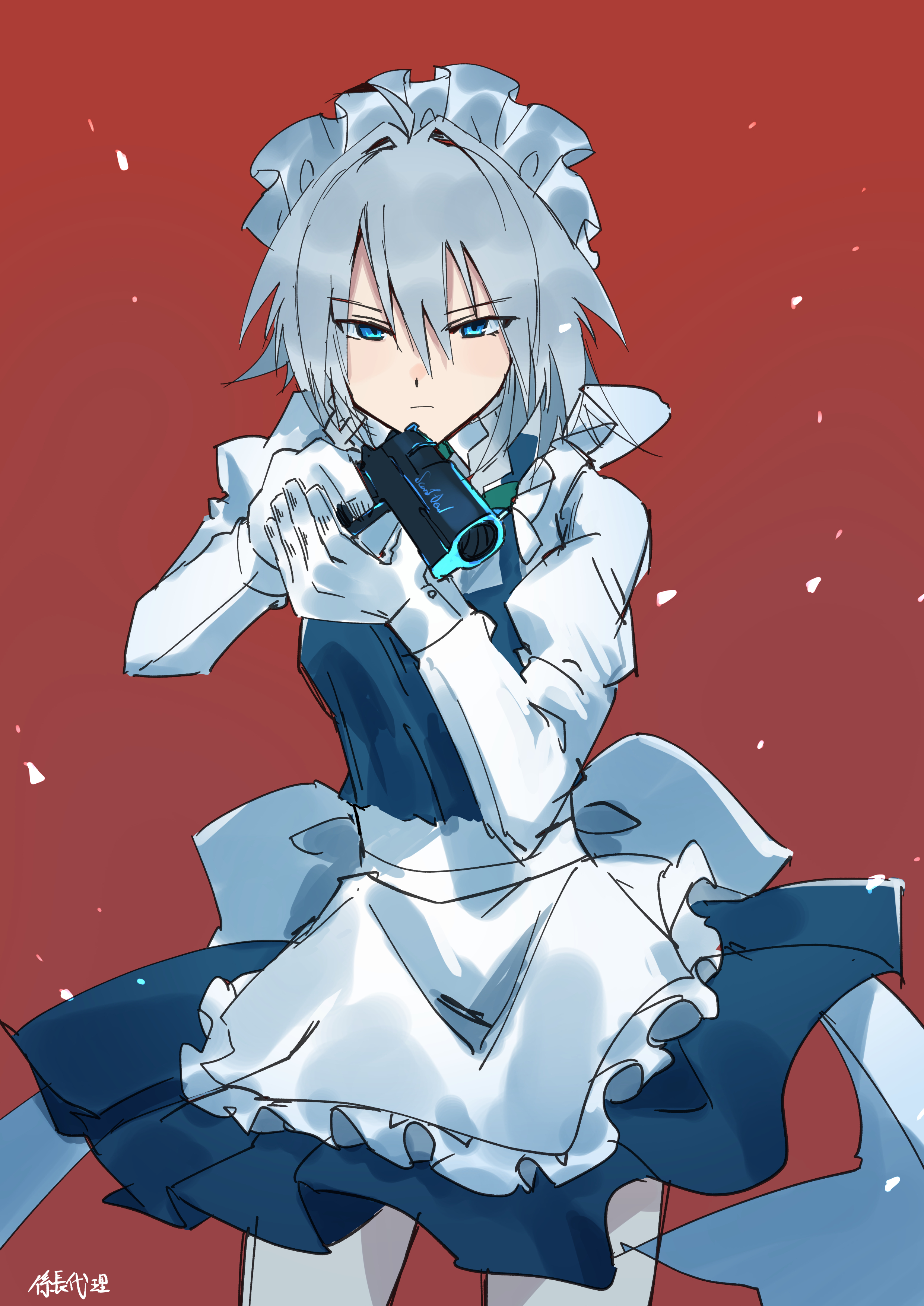 tsukuno tsuki, chando (ado), ado (utaite), absurdres, commentary request, highres, 1girl, ado box, black hair, black jacket, black pants, black skirt, blue eyes, braid, braided hair rings, gloves, hair rings, jacket, long hair, mole, mole under eye, open mouth, pants, skirt, solo, teeth, upper teeth only, utaite, white gloves