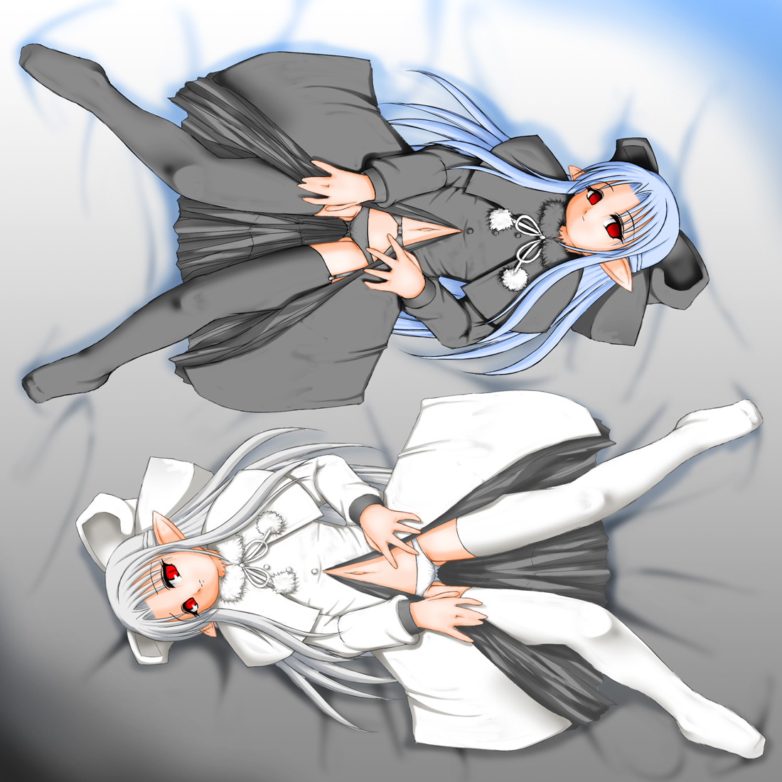 00s2girlsgluteal foldlong hairmultiple girlsnavelpantiespointy earsred eyesthighhighsunderwear