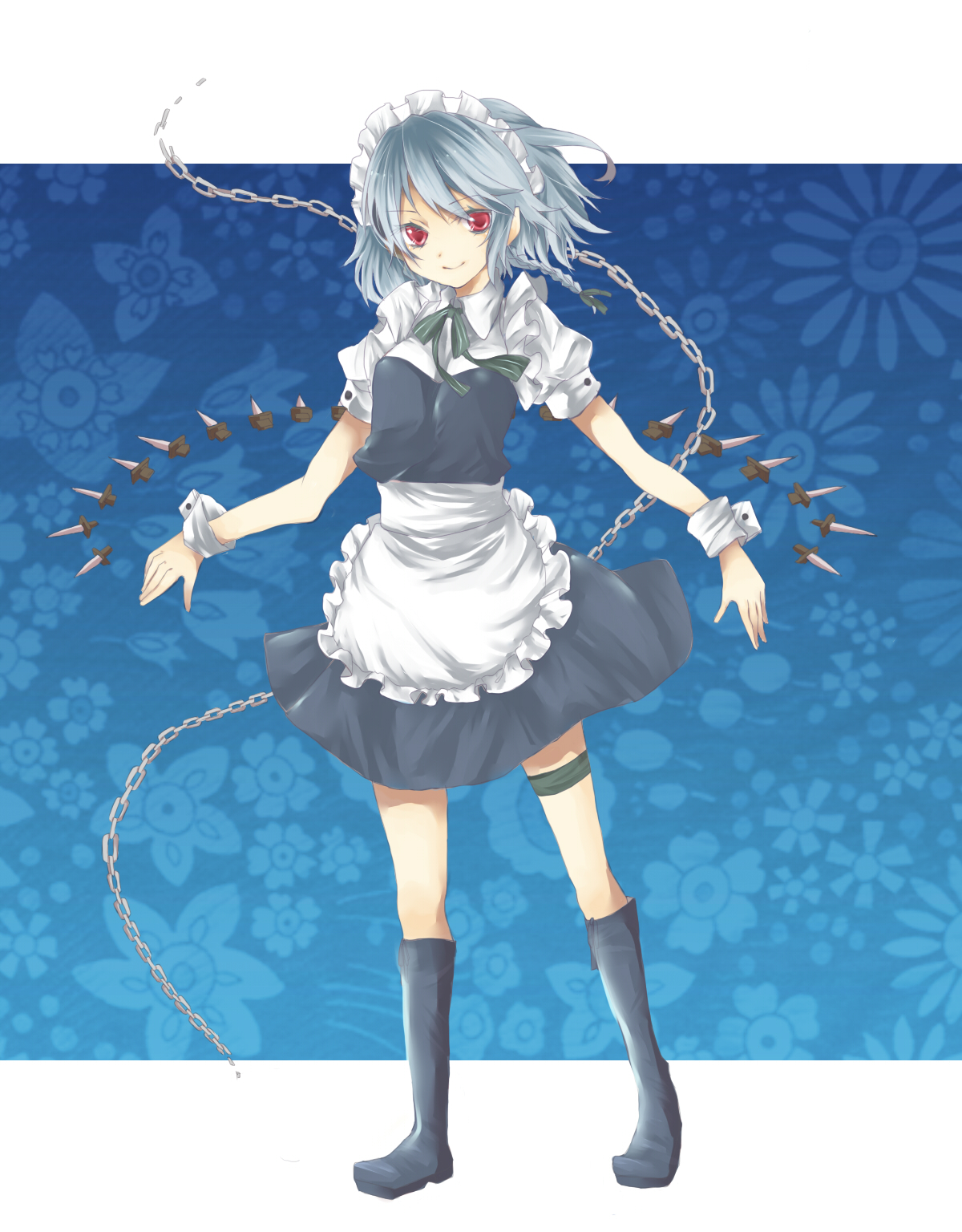 1girlbraidchainfemale focusfull bodygradient backgroundknifemaidred eyesshort hairskirtsolothrowing knifeweaponwrist cuffs
