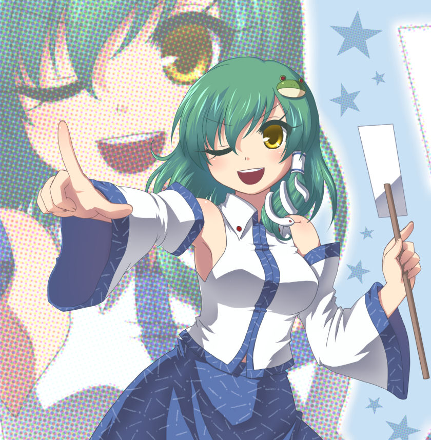 :d1girlarmpitsdetached sleevesfemale focusgreen hairone eye closedopen mouthoutstretched armpointingsmilesolov-shaped eyebrowswinkyellow eyeszoom layer
