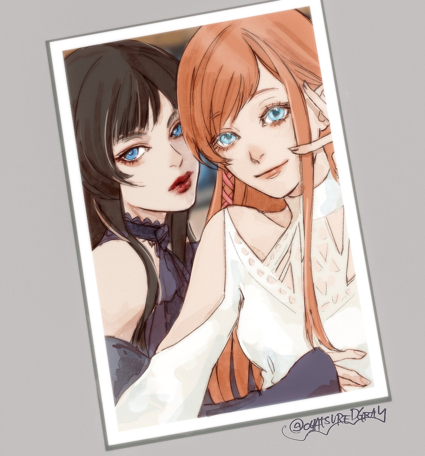 omo cccc, misumi uika, togawa sakiko, bang dream!, bang dream! it's mygo!!!!!, chinese commentary, commentary request, highres, translation request, 2girls, anger vein, blonde hair, blush, cheek pull, chinese text, long sleeves, lower teeth only, medium hair, multiple girls, open mouth, simple background, spoken anger vein, teeth, white background