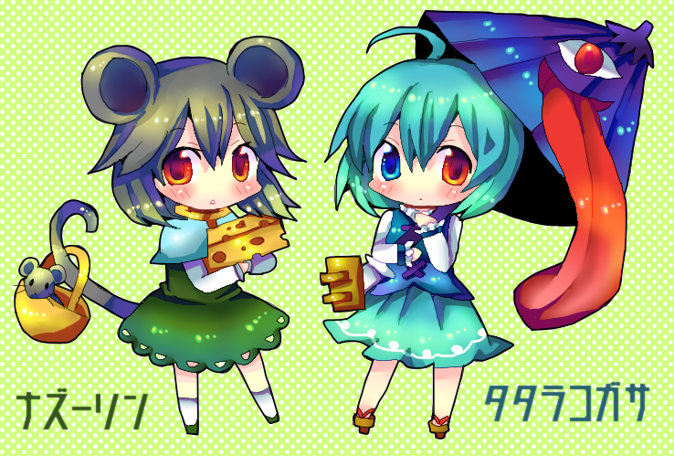 2girlsanimal earsblue eyesblue haircharacter namecheesechibifemale focusfoodgetagrey hairheterochromiakarakasa obakemouse (animal)mouse earsmouse tailmultiple girlsoil-paper umbrellared eyessandalsshort hairtailtongueumbrella