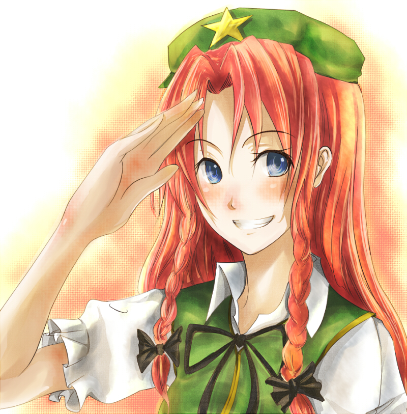 1girlblue eyesblushbraidfemale focusgradient backgroundgrinhatlong hairred hairribbonsalutesmilesolotwin braidsupper bodywhite background
