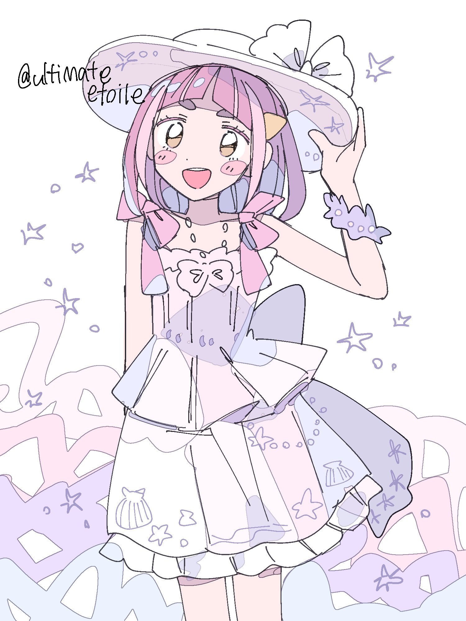:d1girlarched bangsblush stickersbowdresshair ornamenthaircliphathat bowlooking at vieweropen mouthpink bowpink hairshort hairsimple backgroundsmilesolostandingsun hatupper bodywhite backgroundwhite bowwhite dresswhite hatyellow eyes