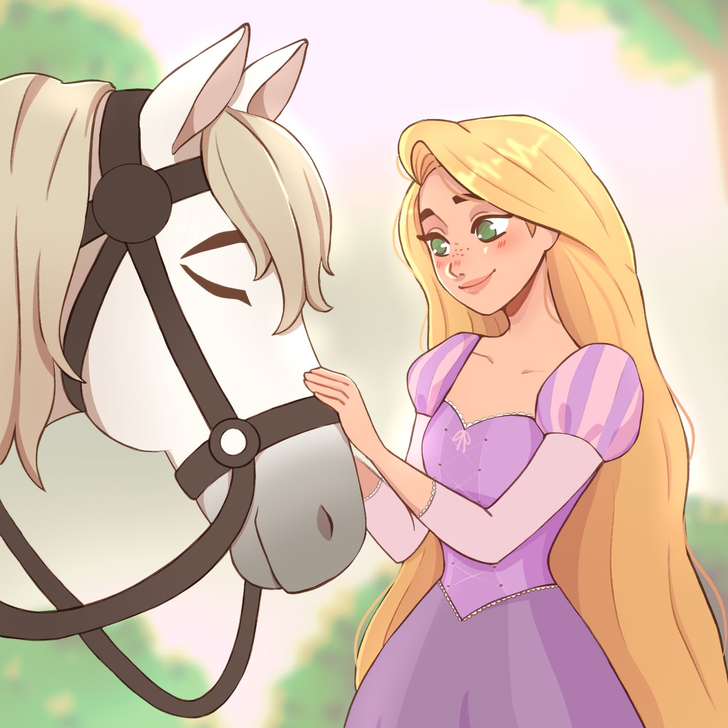 1girlblonde hairblurryblurry backgroundbreastsclosed eyesclosed mouthcowboy shotdressfrecklesgreen eyeshand on another's facehorsejuliet sleeveslight blushlong hairlong sleeveslooking at anothermedium breastspuffy sleevespunziebunniepurple dressreinssmileswept bangs