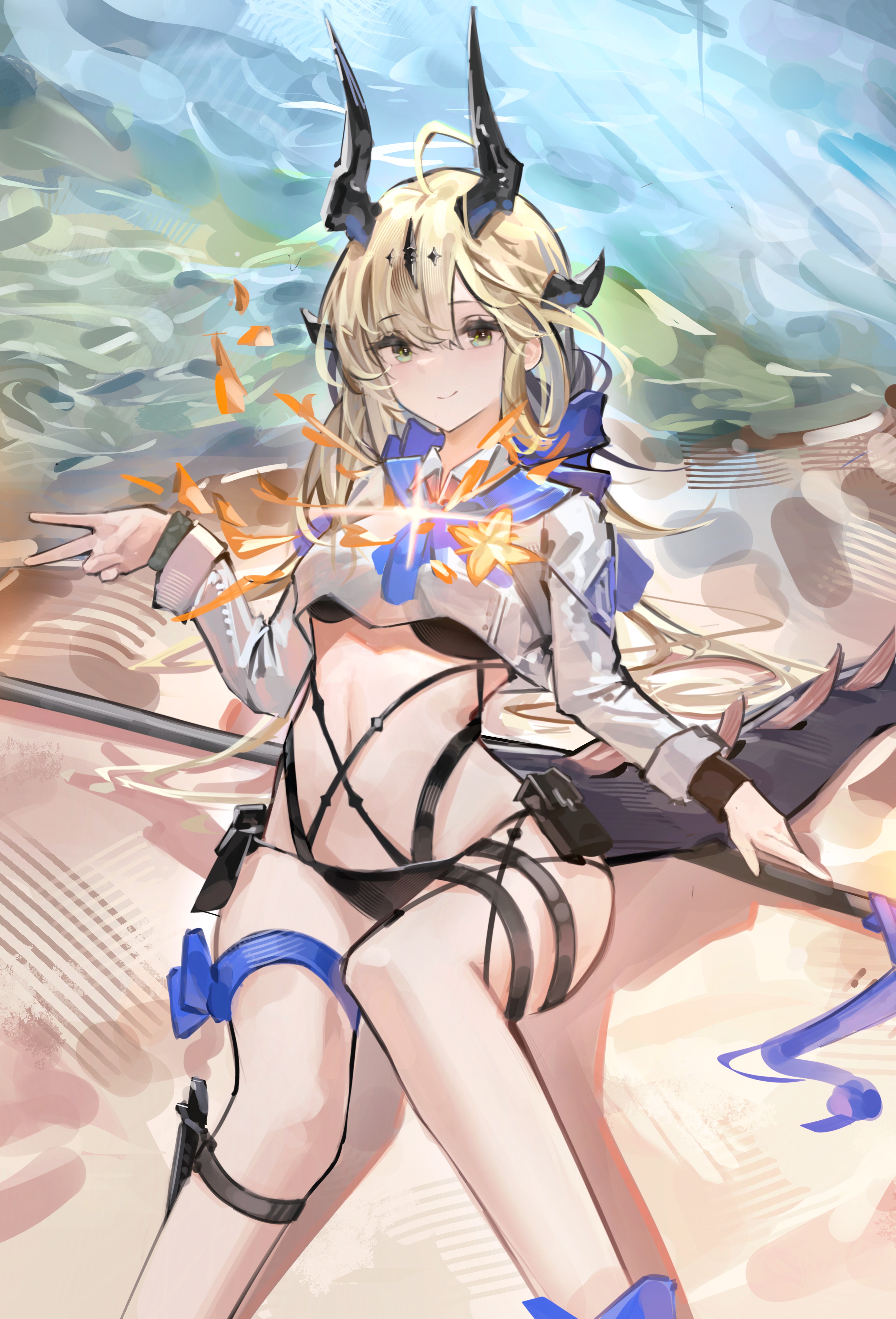 1girlahogebikiniblack bikiniblack hornsblack tailblonde hairclosed mouthcrop topcropped shirtfeet out of framefiregreen eyeshair between eyeshornslong hairlooking at viewermultiple thigh strapsnavelofficial alternate costumeshirtsmilesoloswimsuittailvwhite shirt