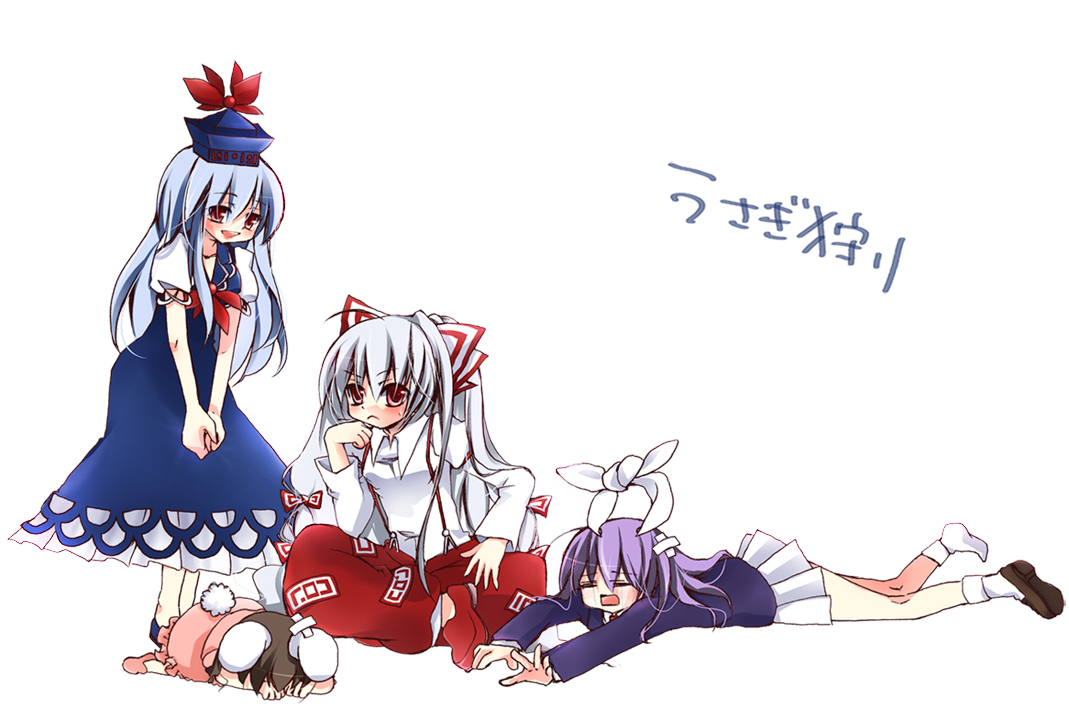 4girlsanimal earsblack hairblue hairfemale focushair ribbonhatlong hairmultiple girlspurple hairrabbit earsred eyesribbonshoessingle shoewhite hair