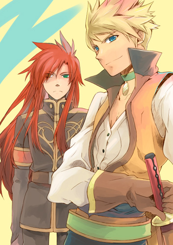 00s2boysalternate costumeblonde hairchokerglovesgreen eyeslong hairmale focusmultiple boysred hairsmileswordweaponyellow background