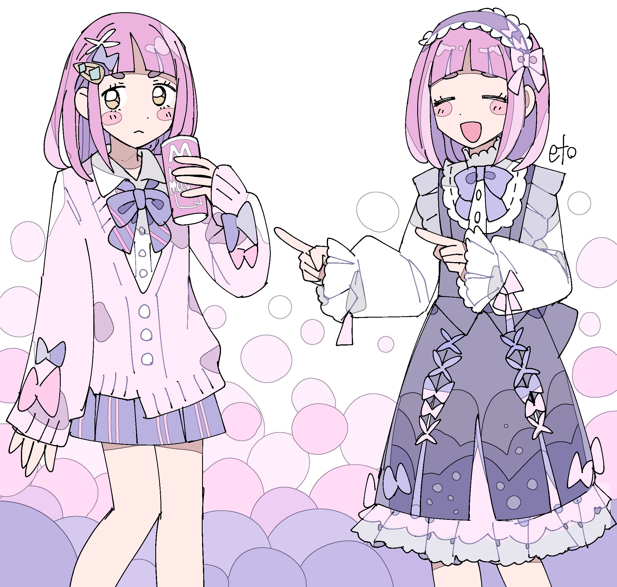 :d1boy1girlalternate costumearched bangsblush stickersbowbowtiecancardiganclosed eyescollared shirtdressfrilled dressfrillshair ornamenthairclipholdingholding canlong sleeveslooking at viewermaid headdressmultiple viewsopen mouthpink bowpink cardiganpink hairpurple bowpurple bowtiepurple dresspurple skirtshirtshort hairsimple backgroundskirtsmilesolostandingupper bodywhite backgroundwhite shirtwhite sleevesyellow eyes
