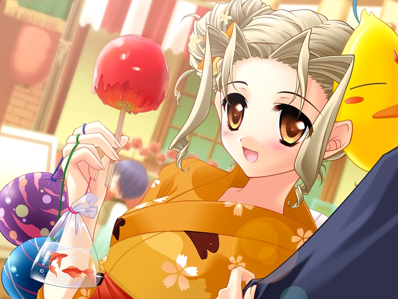 appleballoonblonde hairbrown eyescandy applefestivalfishfoodfruitgoldfishjapanese clotheskimonoyukata