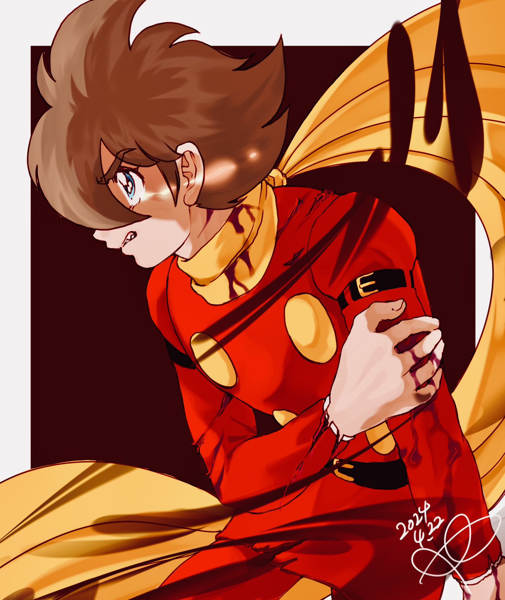 beltblack beltbloodblood on clothesblue eyesbrown haircoatcryingcyborgdynamic posehair over facehair over one eyehand on own armmale focuspantsred coatred pantsscarfsharp teethshort hairsoldierstreaming tearstearsteethyellow scarf