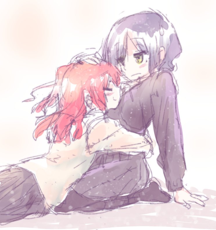 2girlsblue hairblushbreast restbreastsbreasts on headclosed eyeshand on another's waisthugjacketkessoku bandleaning backleaning on personlight frownlong hairlong sleeveslovex2randaisukihonekkolyinglying on personmolemole under eyemultiple girlson stomachpettingred hairshirtshort hairsittingsketchskirtsmall breastssmilewhite shirtyellow eyes