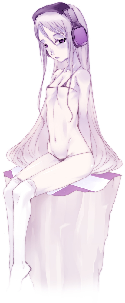 bikiniblushflat chestheadphoneslegslong hairmicro bikiniskinnysoloswimsuitthighhighswhite thighhighs