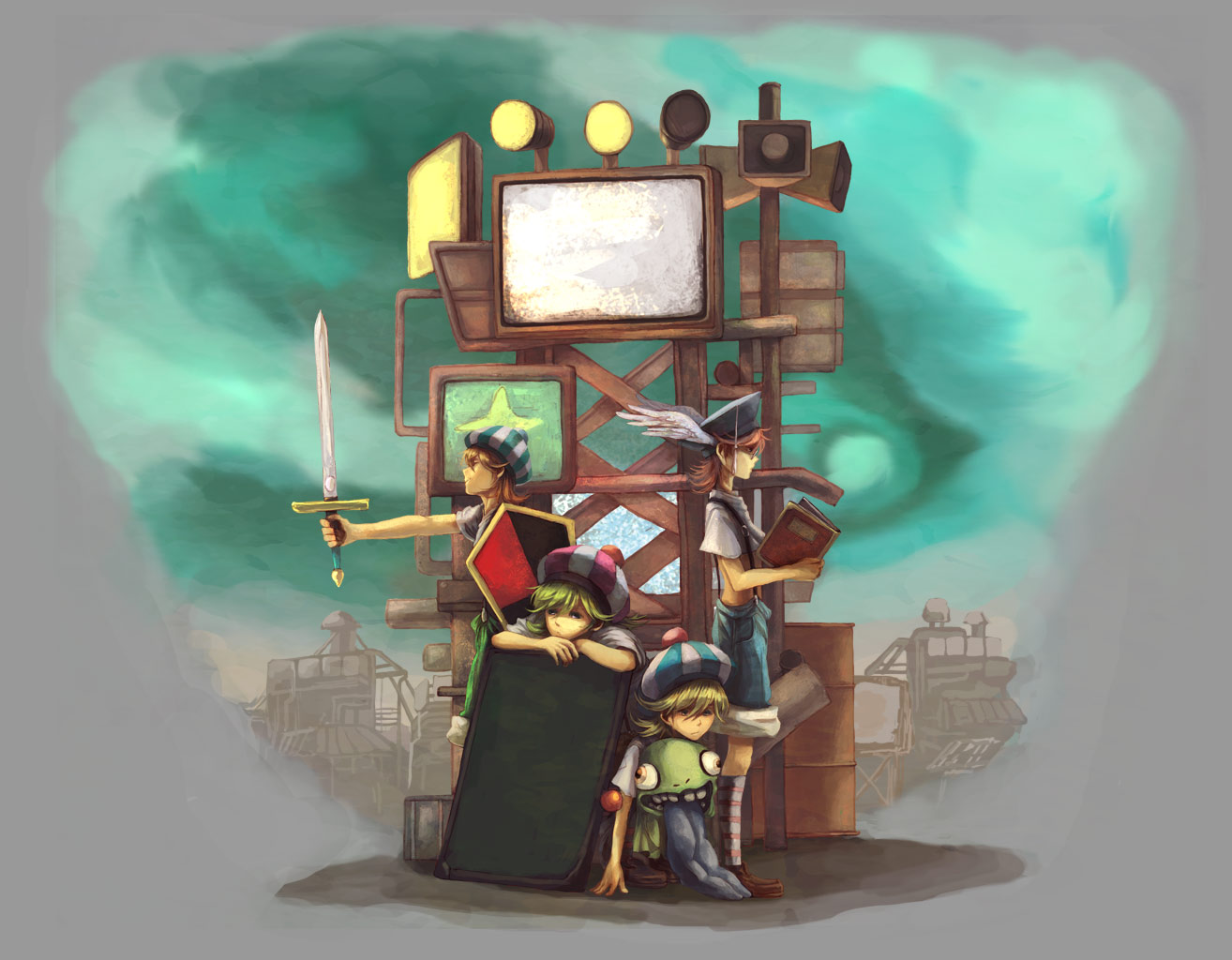 misg1111, amiya (arknights), doctor (arknights), kal'tsit (arknights), ling (arknights), mayors (project moon), skadi (arknights), arknights, limbus company, mili (band), project moon, derivative work, highres, 1boy, 1other, 5girls, album cover redraw, arm at side, beach, blue eyes, bracelet, closed mouth, finger frame, gold bracelet, green robe, hood, jewelry, looking at viewer, looking back, multiple girls, outdoors, pointy ears, robe, shore, tian tian (mili), waving hands, white hair