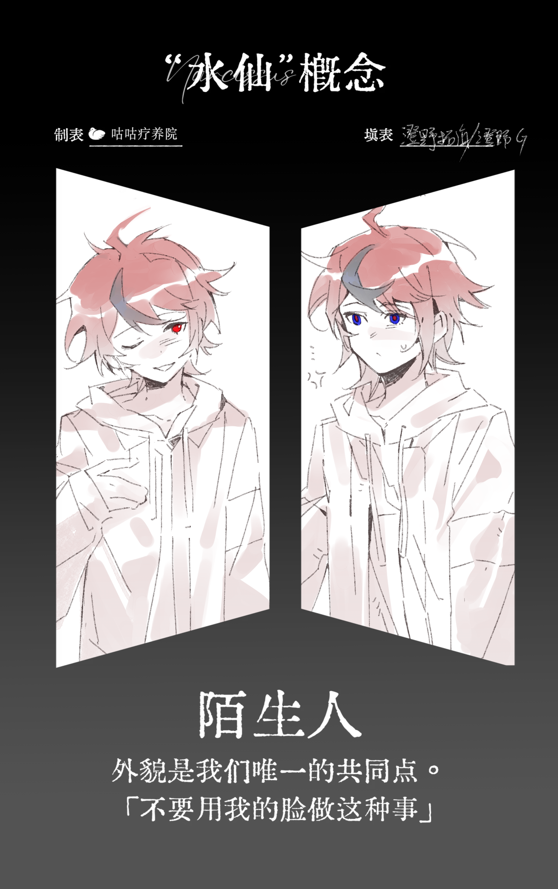 1boy2boysahogeblack hairblue eyeschinese textclosed mouthdrawstringdual personahand on own chesthoodhood downhoodiejacketjacket over hoodielong sleevesmale focusmulticolored hairmultiple boysofficial alternate eye colorone eye closedopen clothesopen jacketpartially coloredred eyesred hairred pupilsshort hairsleeves past wristssmilestreaked hairsweattwo-tone hair