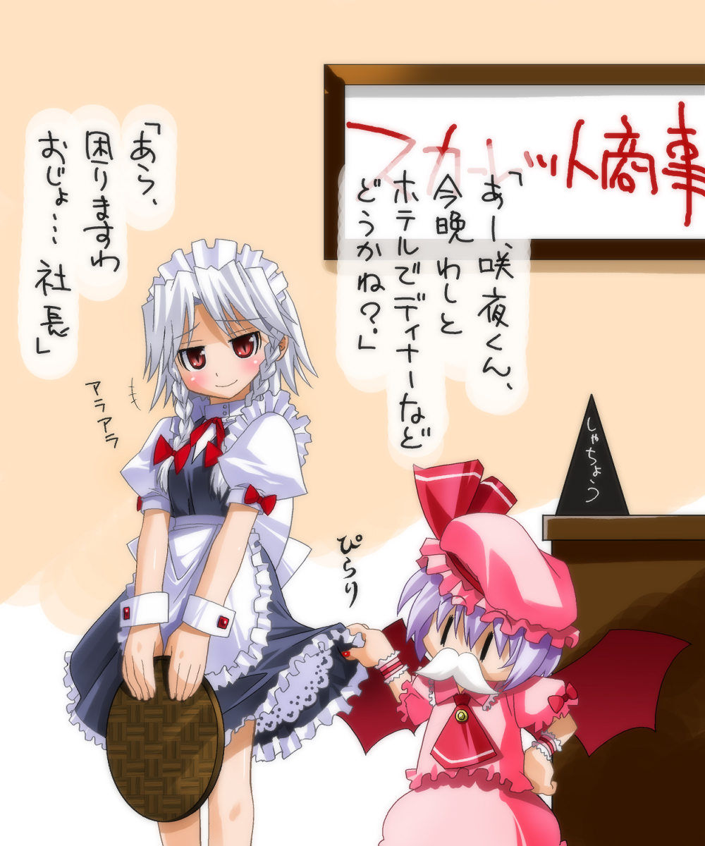 1boy2girlsbat wingsblue hairblushbraidclothes liftcuffsfacial hairfake facial hairfake mustachefemale focushair ribbonhairbandhand on own hiphathip focusindoorsmaidmultiple girlsmustacheparodypurple hairred eyesribbonshort hairskirtskirt lifttraytwin braidswhite hairwingswrist cuffs