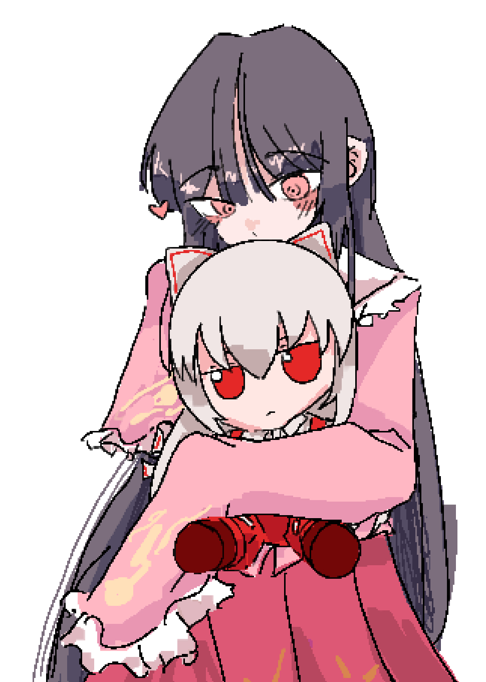 2girlsblack hairblushdollfrilled skirtfrillsfumo (doll)heartholdingholding dolllong hairmultiple girlspink eyespink shirtpink skirtshirtsimple backgroundskirtwhite background