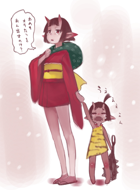 age differenceanimal printchildclub (weapon)demon girlhornsjapanese clotheskanaboukimonomother and daughteronipointy earsred onispiked battearstiger printweaponyukata