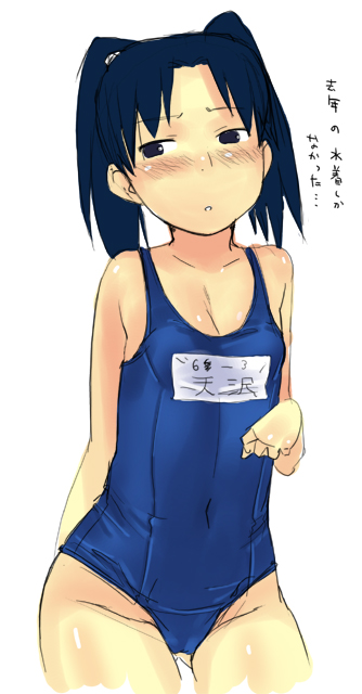 00s1girlblushbreastsfemale focusflat chestnavelone-piece swimsuitschool swimsuitschool uniformshort hairsimple backgroundsolostandingswimsuittext focuswhite background