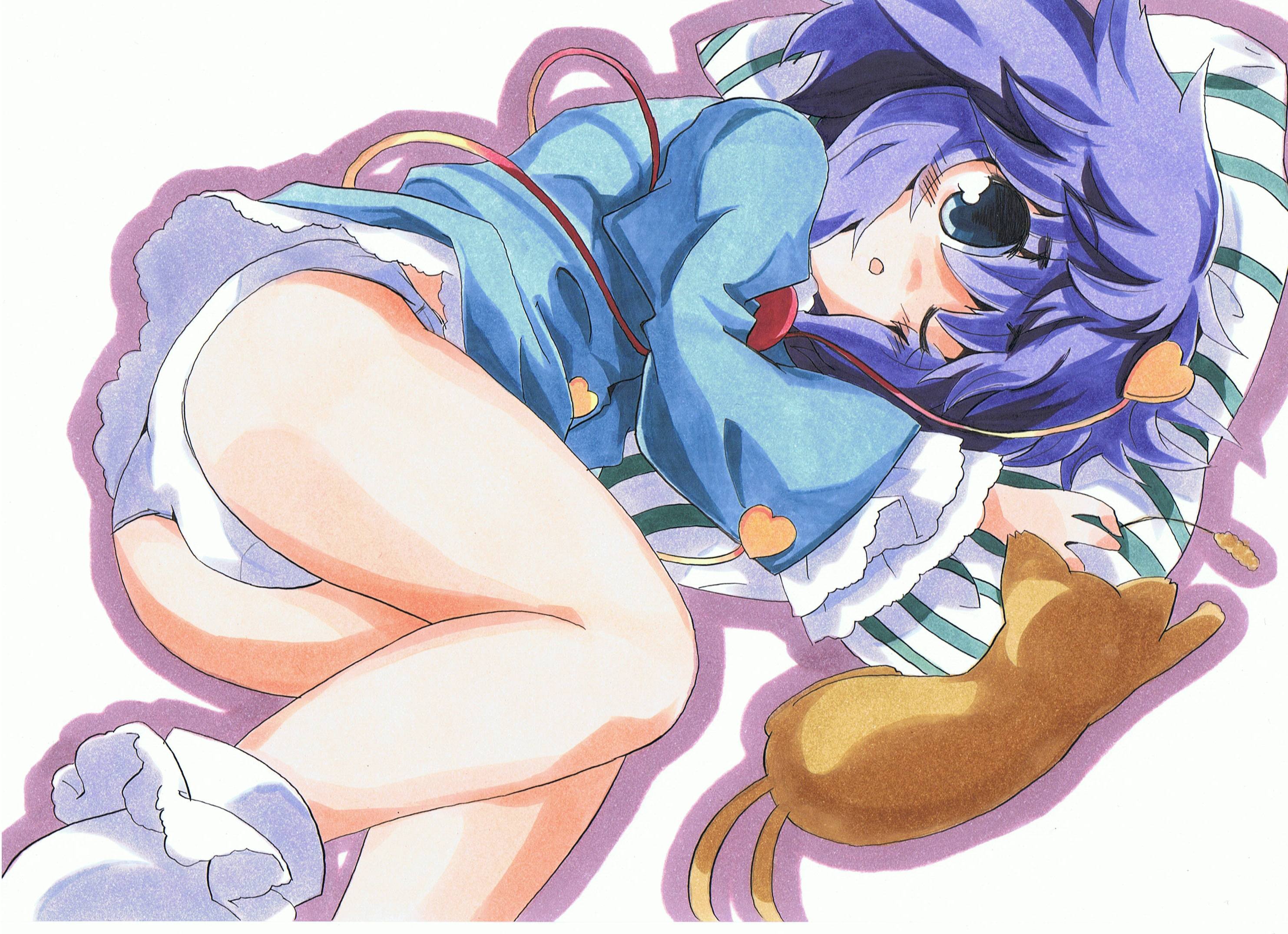 1girlblue eyescatchildfemale focusone eye closedpantiespurple hairshort hairsolounderwearwhite pantieswink