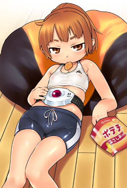 1girlbike shortsblushbreastsbrown eyesbrown hairchips (food)female focusfoodlolilyingmouth holdnippleson backpillowplumprider beltsee-through clothessee-through sports brasmall breastssolospandexsports bra
