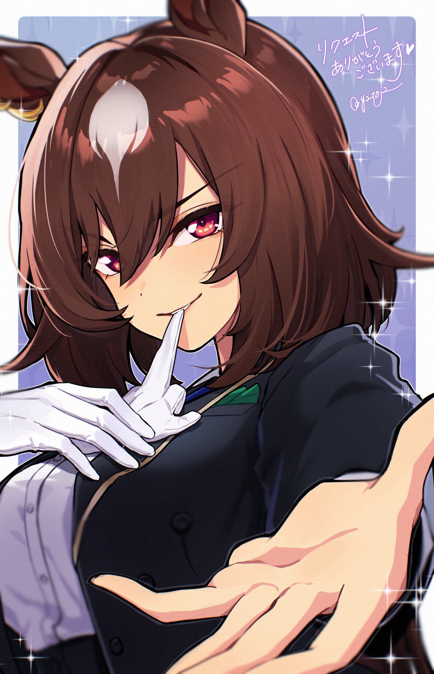 1girlanimal earsbrown hairgloveshorse earshorse girlmulticolored hairreachingred eyessolostreaked hairupper bodywhite gloveswhite hair