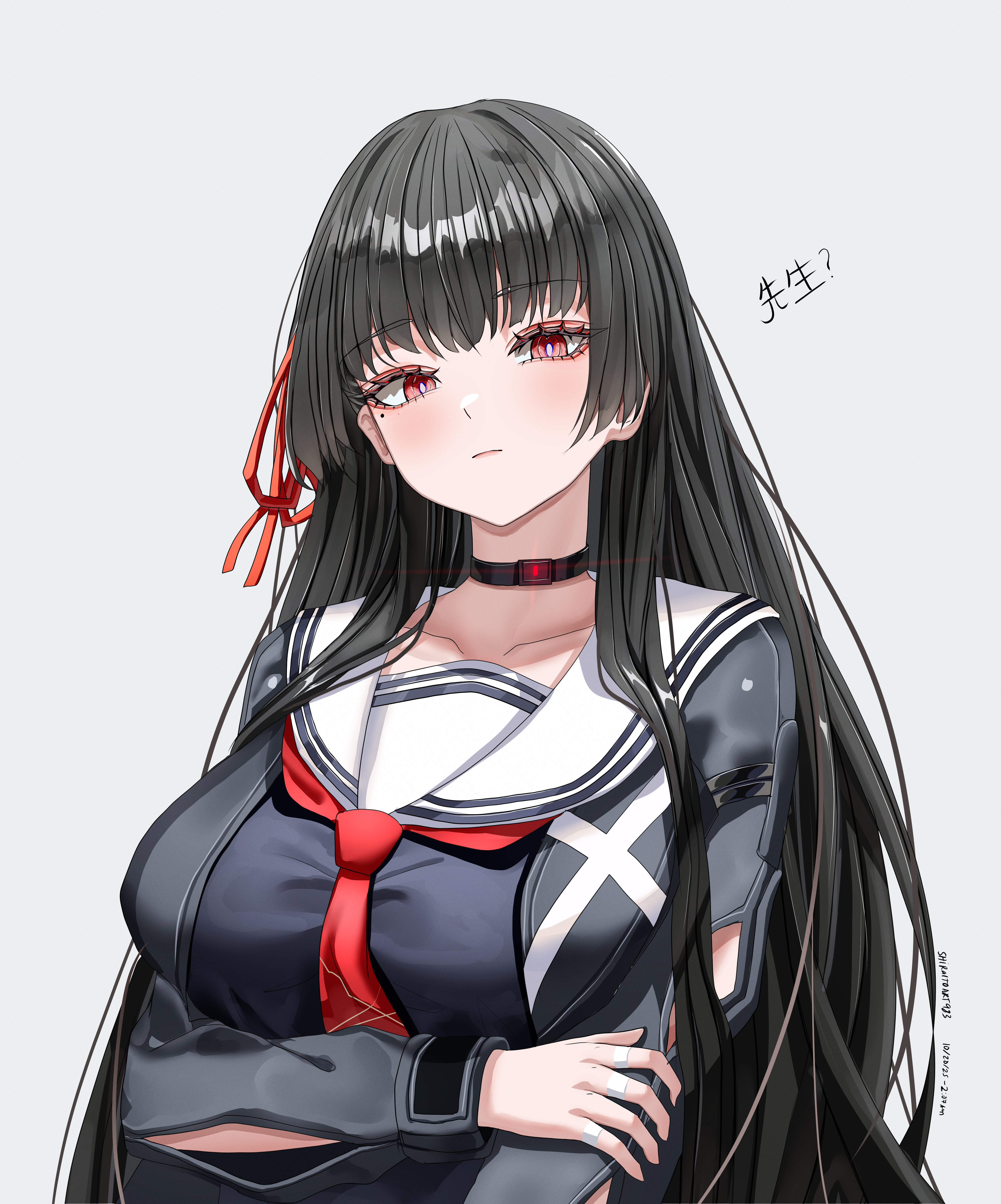 1girlarm cutoutblack chokerblack hairblack jacketblack shirtbreastschokerclosed mouthclothing cutoutcollarbonegrey backgroundhair ribbonholding own armjacketlarge breastslong hairlong sleeveslooking at viewermolemole under eyeneckerchiefred eyesred neckerchiefred ribbonribbonsailor collarshirtsimple backgroundsoloupper bodywhite sailor collar