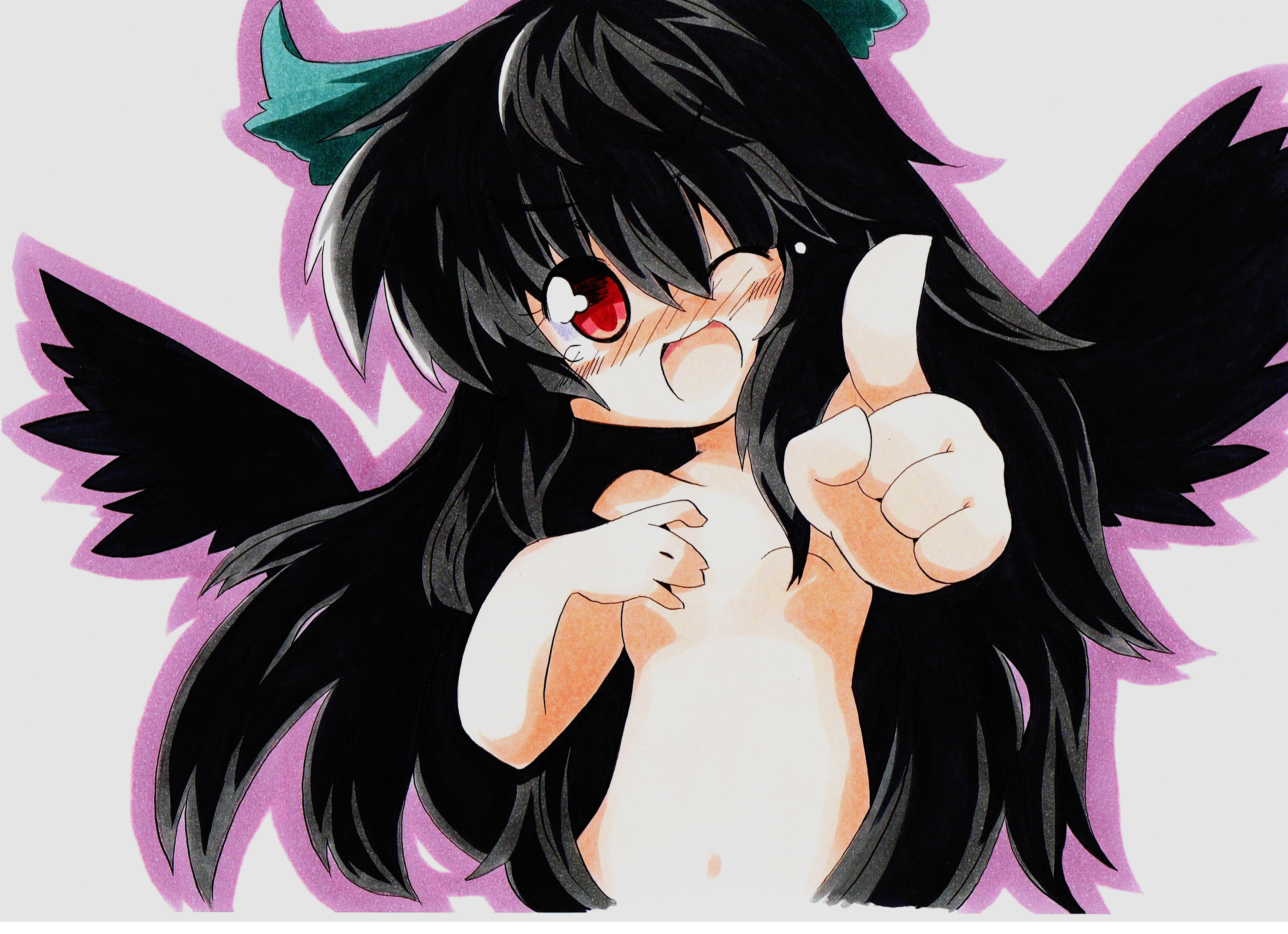 1girlblack hairfemale focusflat chestlaughinglong hairnudeone eye closedpointingpointing at viewerred eyessolovery long hairwingswink