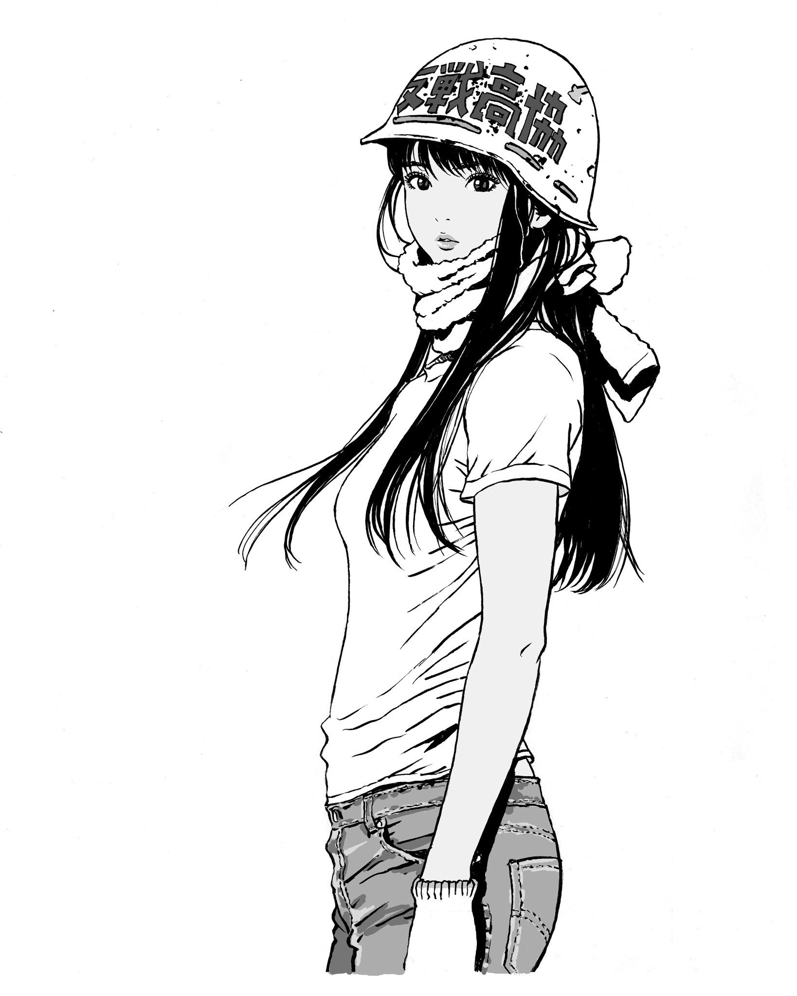 1girlbreastscowboy shotdenimeyelashesfrom sidegreyscalehelmetjeanslipslong hairlooking at viewerlooking to the sidemedium breastsmonochromepantsshirtshort sleevessimple backgroundsolostandingt-shirtthick lipstoweltowel around neckwhite backgroundwork gloves
