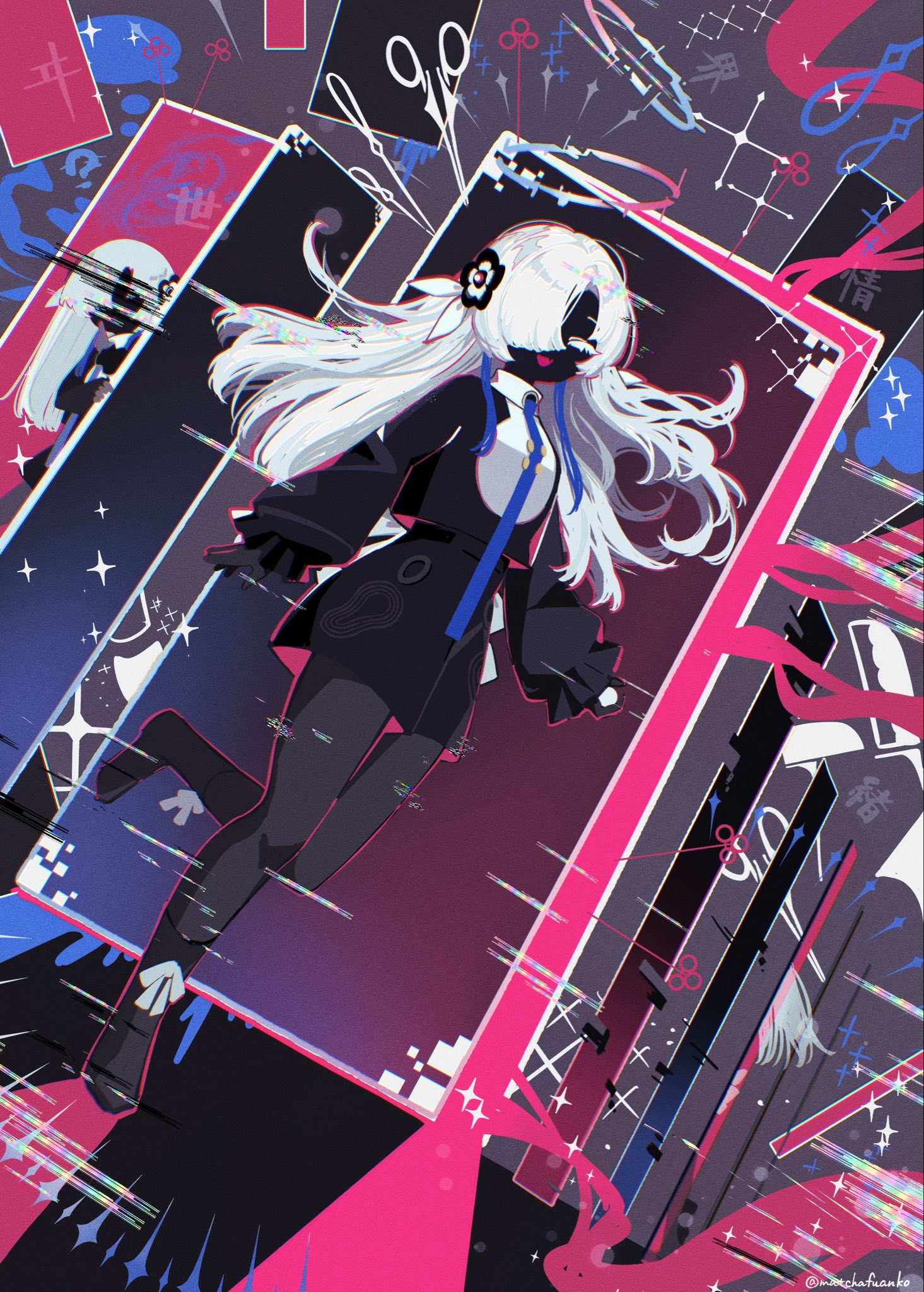 3girlsblack jacketblack pantyhoseblack skinblue hairclonecolored skinfloating hairflowerfull bodyhair flowerhair ornamenthair over one eyejacketlong hairmulticolored hairmultiple girlsopen mouthpantyhosesmilesurrealtwo-tone hairwhite hair
