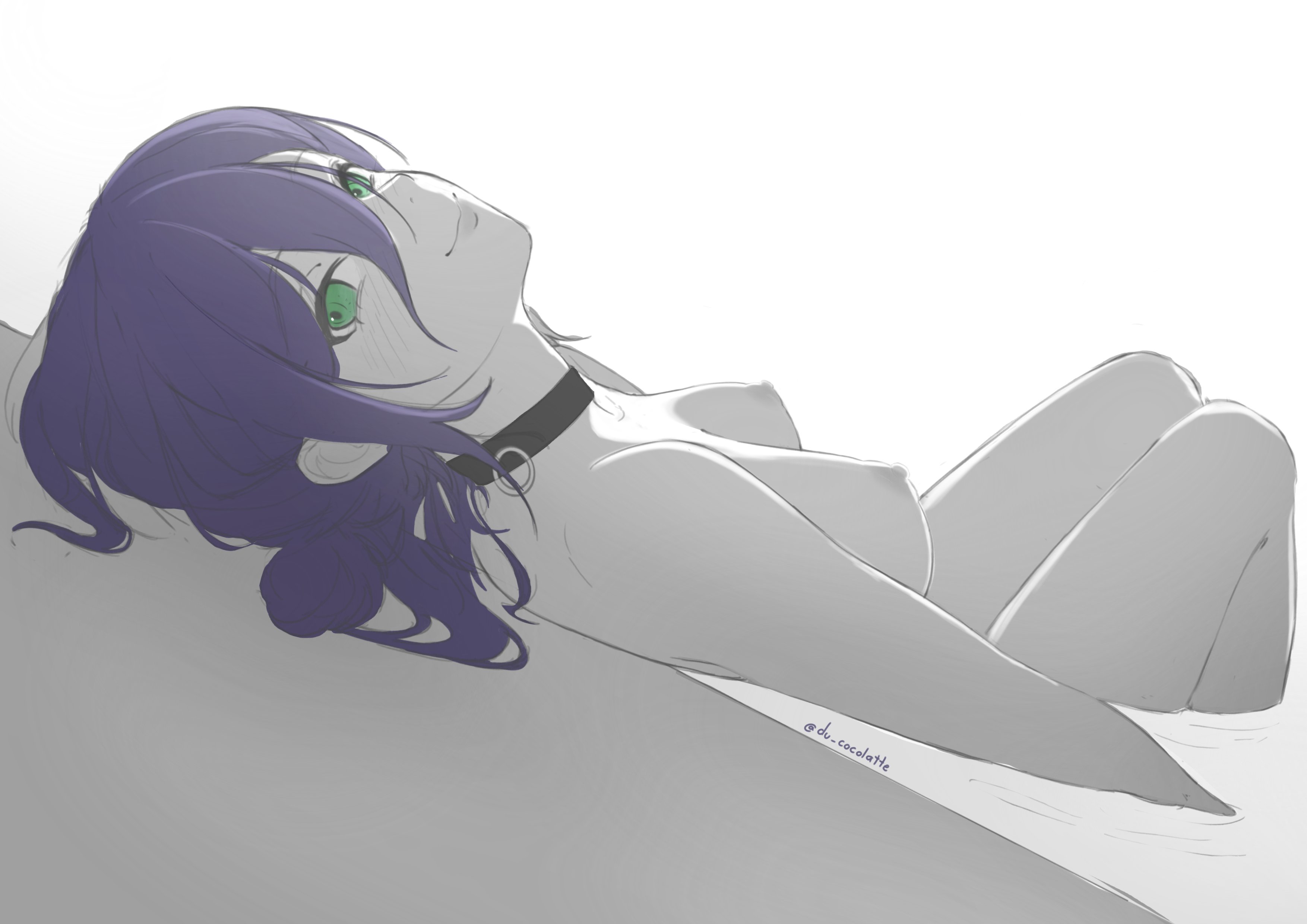 1girlblack chokerbreastschokercompletely nudedu cocolattedutch anglegreen eyeslight smilelipslooking at viewerlyingmedium breastsmedium hairnipplesnudeon backpartially coloredpartially submergedperky breastspuffy nipplespurple hairsidelockssketchsmilesolotwitter username