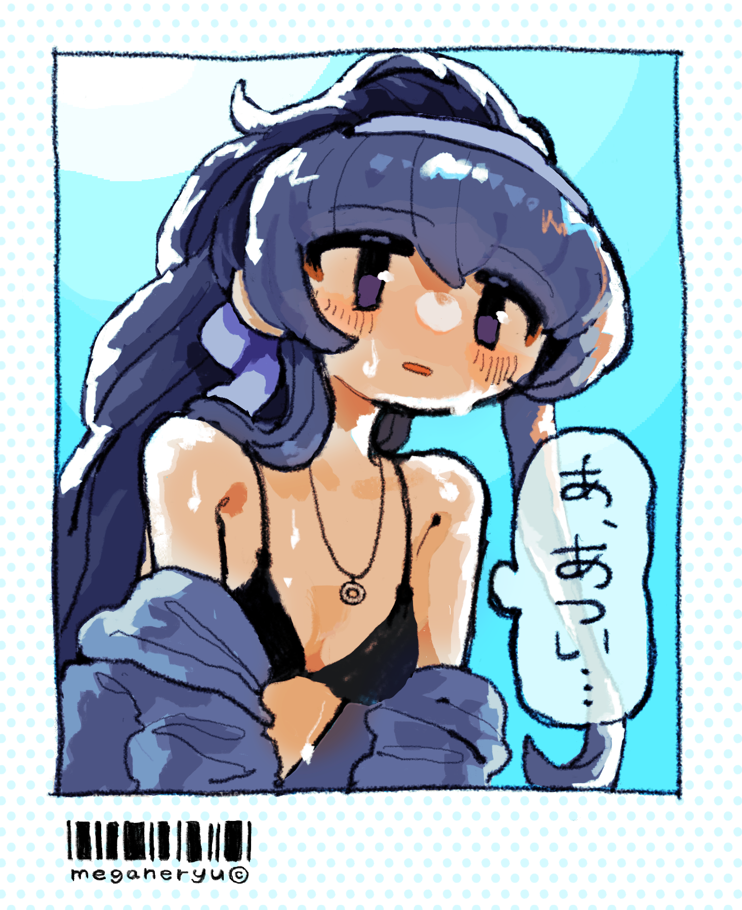 1girlartist namebarcodebare shouldersbikiniblack bikiniblue skyblushbreastsdayjacketjacket partially removedjewelrylong hairlooking at vieweropen clothesopen jacketopen mouthoutdoorspendantpolka dot borderponytailpurple eyespurple hairpurple jacketskysmall breastssolospeech bubblesweatswimsuitupper body