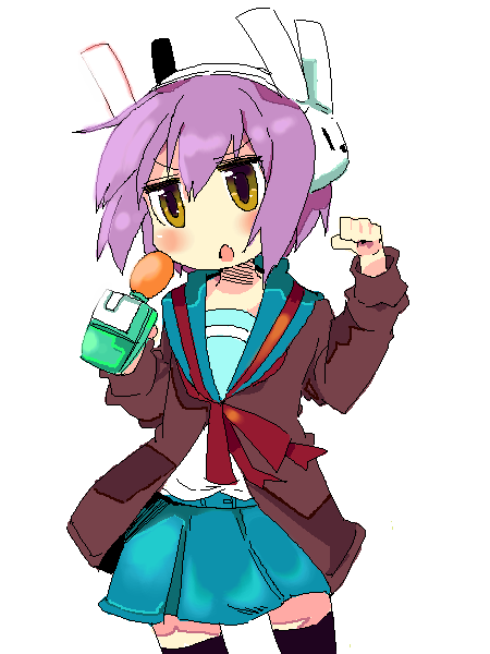 00s1girlbunny headphonescardiganfemale focusheadphonesmicrophoneoekakipurple hairschool uniformserafukushort hairsolothighhighsyellow eyes