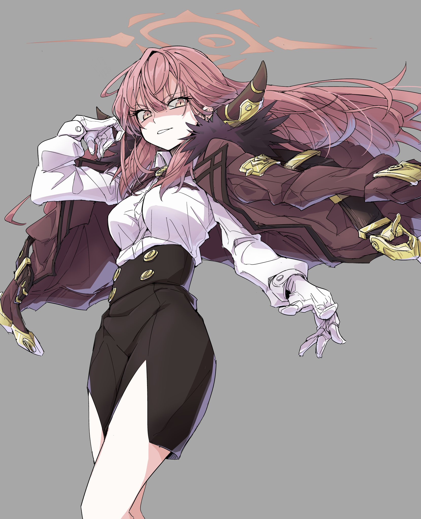 1girlblack skirtblunt bangsbreastsbuttonscoatcoat on shoulderscollared shirtdemon girldemon hornsdouble-breastedeyelashesfeet out of framefighting stancefloating hairfur trimfur-trimmed coatglovesgrey backgroundgrinhair between eyeshalohand uphigh-waist skirthornslarge breastslong hairneck ribbonoutstretched armpencil skirtpink hairpink halored ribbonribbonschool uniformshaded faceshirtside slitsidelockssimple backgroundskirtslit pupilssmilesolostandingv-shaped eyebrowsvery long hairwhite gloveswhite shirtyellow eyes