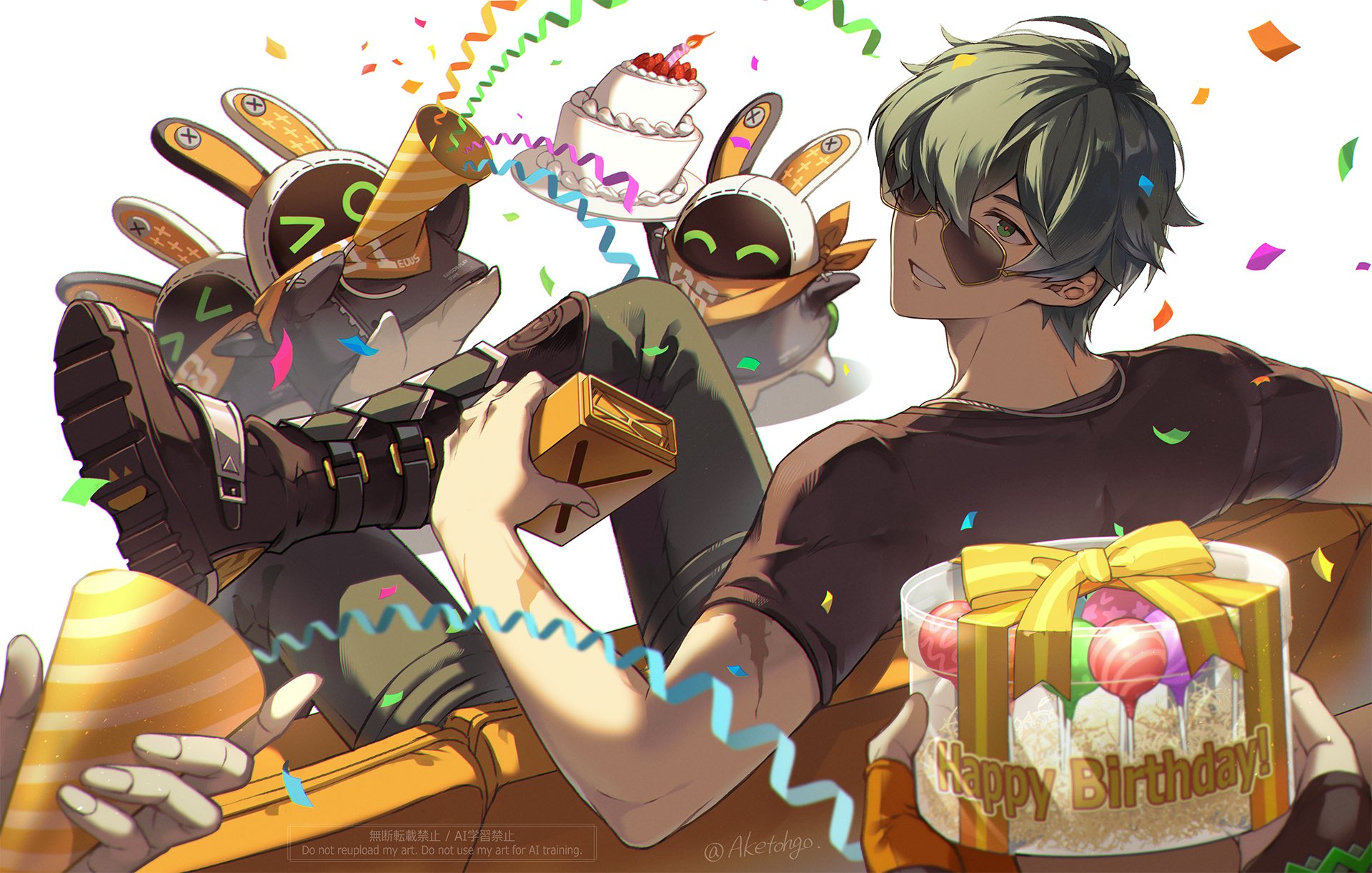 1boy1girl2boys3othersbirthdaybirthday cakeblack bootsblack shirtbootscakeconfetticouchfingerless glovesfoodfrom behindgiftglovesgreen eyesgreen hairgreen pantsgrinhair between eyeshair over one eyehappy birthdayholdingholding giftjewelrylooking backlooking over eyewearmultiple boysmultiple othersnecklaceon couchpantsparty popperpovpov handsred pupilsscarscar on armshirtshort hairsittingsmilesunglassestwitter usernamewhite background
