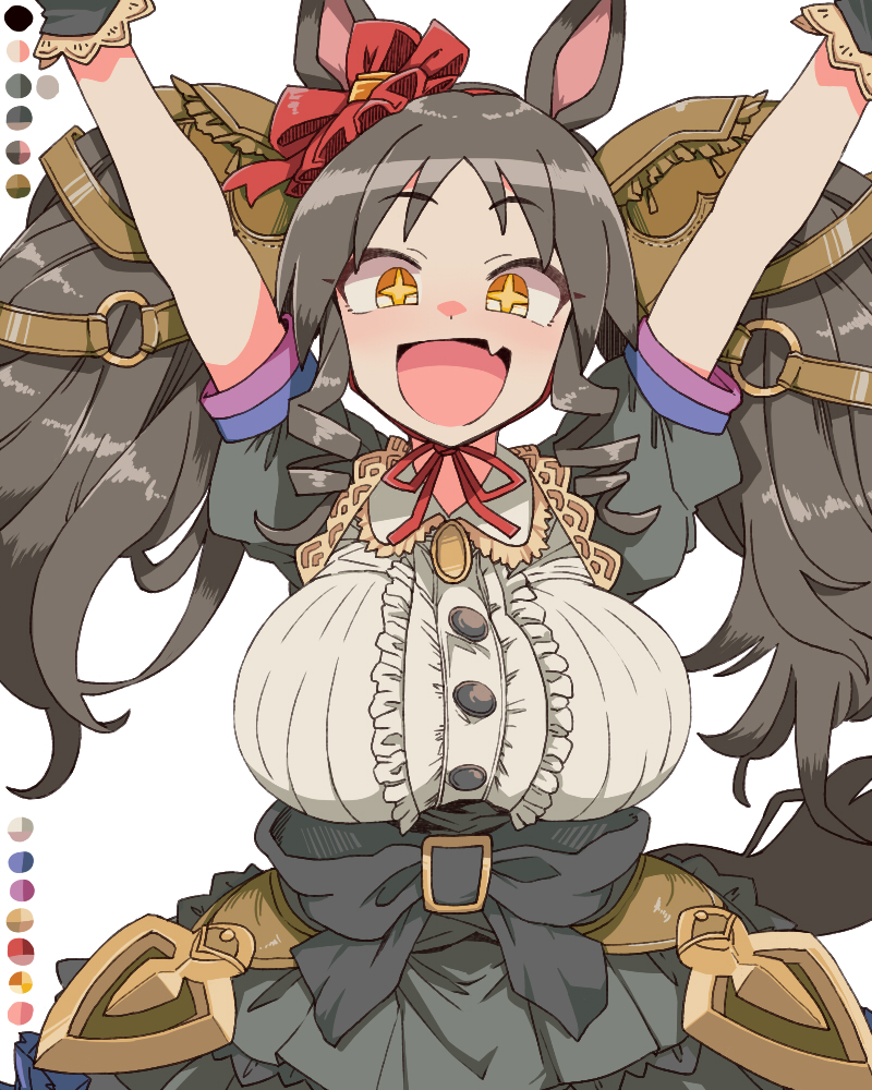 1boy1girlanimal earsarms upblack dressblack hairblushbowbreastscenter frillsdressear bowear ornamentfangfrillshair ornamenthairbandhorse earshorse girlhorse taillarge breastslong hairlooking at vieweropen mouthpuffy sleevesred hairbandshort sleevessimple backgroundskin fangsmilesolotailtwintailswhite backgroundwhite dressyellow eyes