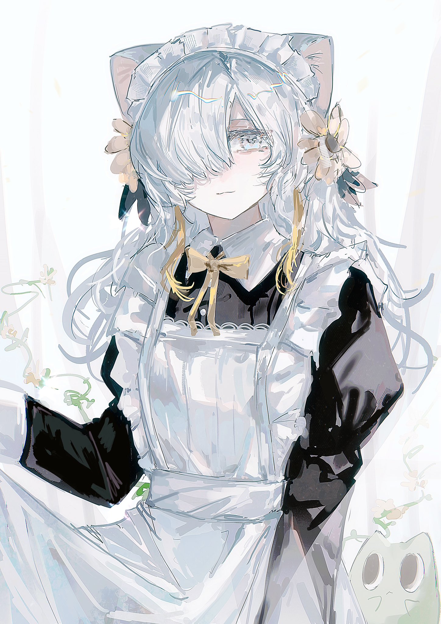 1girlanimal earsapronblack dressblonde haircat earscreaturedressflowergomidasu (kamitsubaki studio)hair flowerhair ornamenthair over one eyelong hairlooking at viewermaidmaid headdressmulticolored hairsolotwo-tone hairwhite eyeswhite hair