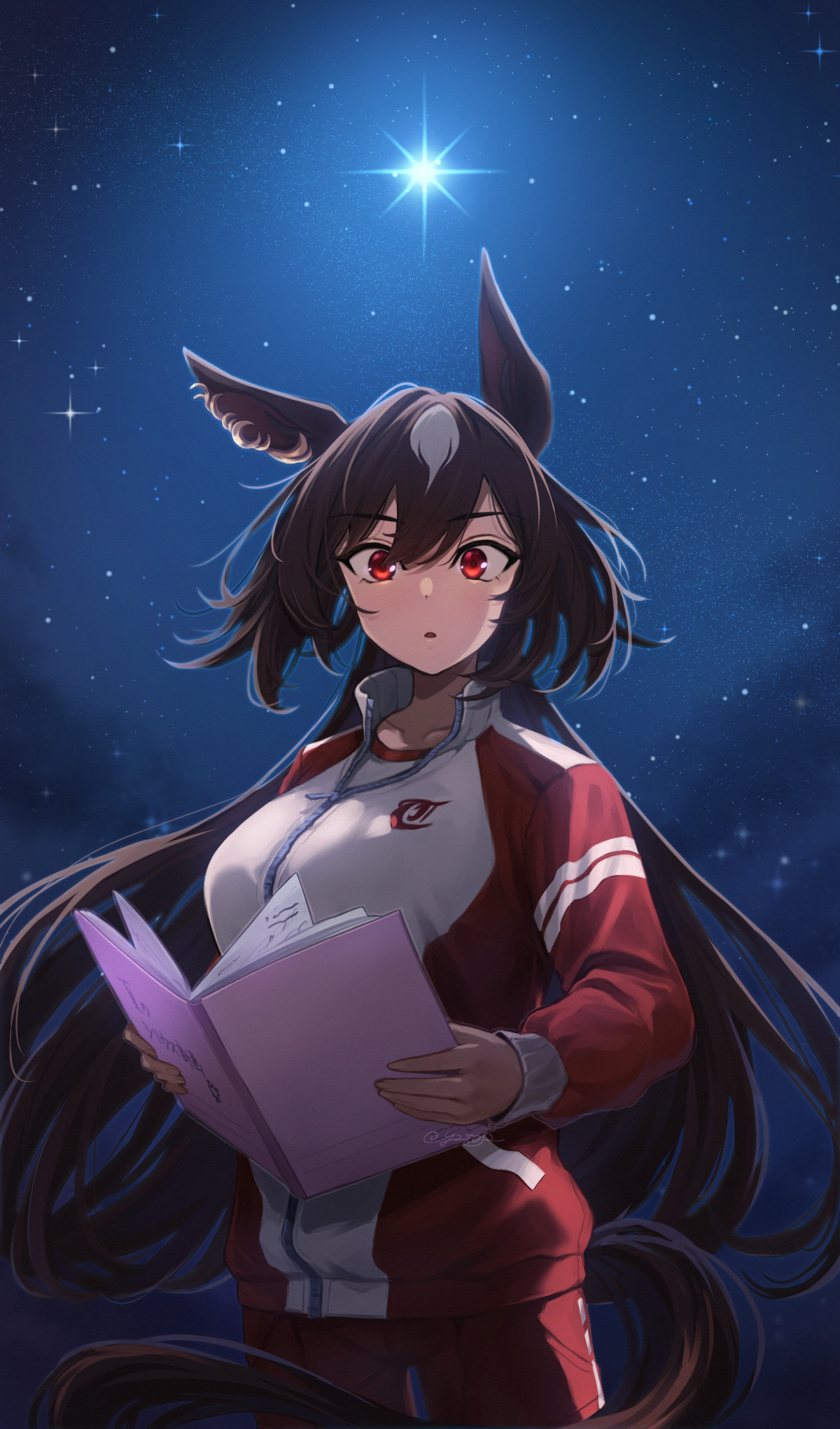 1girlanimal earsbookbrown haircowboy shothair between eyesholdingholding bookhorse earshorse girlhorse tailjacketlong sleeveslooking at viewermulticolored hairnightnight skypantsparted lipspartially unzippedred eyesred jacketred pantsskysolostar (sky)streaked hairsurprisedtailtracen training uniformtrack jackettrack pantswhite hairwide-eyedzipper