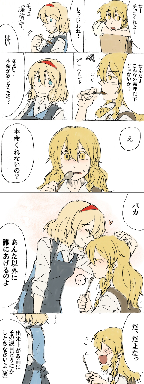 2girlsapronblonde hairblue eyesbraidchocolatecomicfemale focushairbandheartlong hairmultiple girlsshort hairspoonyellow eyes