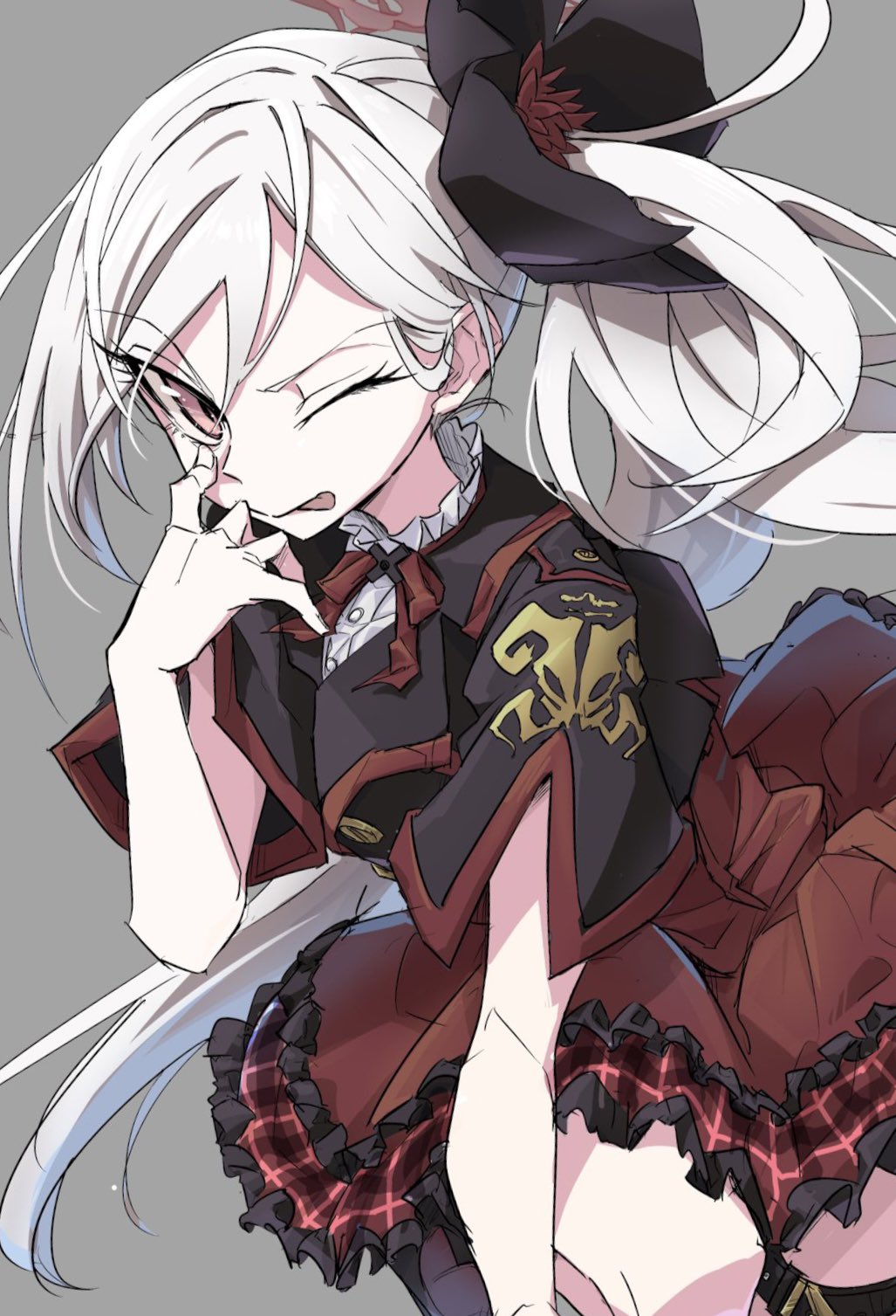 :p1girlakanbeblack flowerblack shirtclosed mouthcowboy shotdutch angleeyelasheseyelid pullfloating hairflowerfrilled skirtfrillsgrey backgroundgrey hairhair behind earhair between eyeshair flowerhair ornamenthalohand uphigh-waist skirtlong hairlooking at viewerneck ribbonone eye closedplaid clothesplaid skirtred eyesred halored ribbonred skirtribbonschool uniformshirtshort sleevesside ponytailsimple backgroundskirtsmilesolothigh straptonguetongue outtsurimev-shaped eyebrowsvery long hair